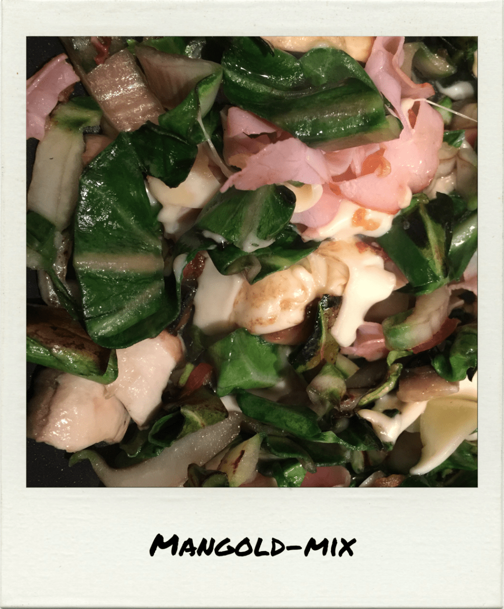 Zugegeben – ich habe Mangold bis dato max. gegessen aber noch nie selbst gekocht. Auf der Suche nach Wintergemüse außerhalb der Verpackung, habe ich ihn beim Einkaufen entdeckt und mit Resten (Champignons, Schinken und Käse) verarbeitet. Das Ergebnis hatte durchaus seinen Charme und ist eine gute Alternative zur „Wurstnudel-Restlverwertung“ 🙂