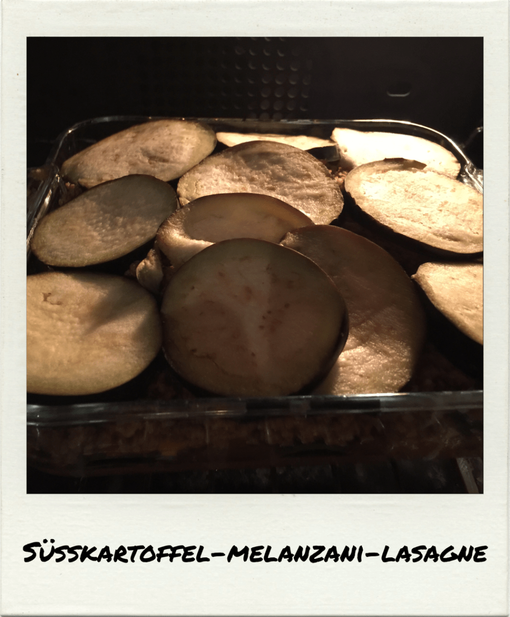 - Wenn Sauce fertig, Bitterstoffe der Melanzani enztogen und die Süßkartoffel geschnitten sind, kann das schichten beginnen.